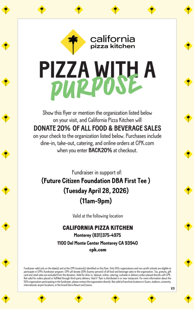 Dine with purpose on Tuesday, April 28 at California Pizza Kitchen in Monterey. By mentioning the Future Citizen Foundation DBA First Tee or showing the fundraiser flyer, 20% of your total bill will be donated to support their mission. Valid for dine-in, takeout, catering, and online orders with code BACK20. Gather friends, bring family, and be part of a day that turns dining into impact.